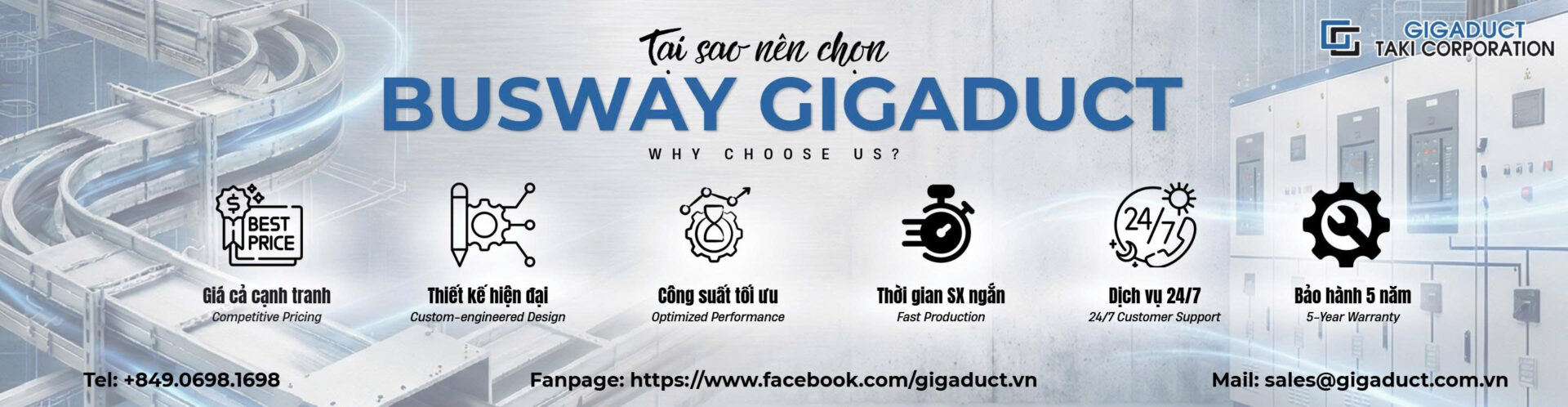 GIGADUCT TAKI CORPORATIONTAKI là doanh nghiệp Việt Nam chuyên nghiên cứu, sản xuất và cung cấp hệ thống Busway chất lượng cao. Thương hiệu GIGADUCT mang đến giải pháp phân phối điện an toàn – ổn định – tối ưu hiệu suất, với thiết kế hiện đại, đáp ứng các tiêu chuẩn quốc tế, phù hợp cho các công trình công nghiệp và thương mại quy mô lớn.
